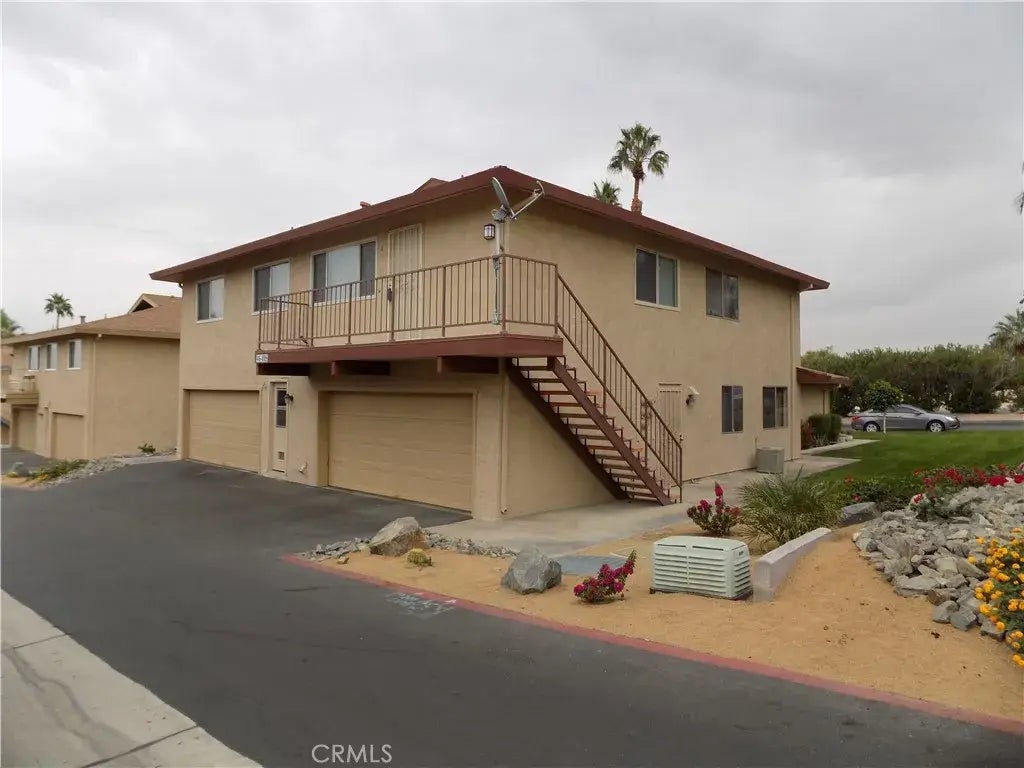 Remodeled 2 bedroom 1 bath upstairs unit. The Private stairs leads to the unit with no one below! Rustique laminate flooring installed in living room, dining room, hallways and bedrooms. Vinyl dual Pane Low-E windows throughout with interior mini-blinds and blackout curtains. The entry has a coat closet and opens to the living room, dining area and kitchen. The kitchen has Espresso colour maple cabinets with Calacatta Quartz counter tops, hanging light fixtures, Frigidaire stainless steel electric stove and an overhead microwave oven with exhaust fan, a Kenmore white refrigerator, brushed nickel faucet and sink, and ceramic tile flooring. The dining room, adjacent to the kitchen, has a ceiling fan and window over looking the court yard. The bathroom has a shower over-tub, a single vanity with brushed nickel faucet, mirror, light fixture and ceramic tile flooring. Both bedrooms have ceiling fans and nice sized closets. The hallway has two large capacity closets. The town-home offers Central Air and Heat. The unit shares a garage for one car. A community laundry room is adjacent to the garage. The community has two pools with spas for your use. The town-home is within a short distance to El Paseo Shopping District includes Shops, Restaurants, Art, Jewelry and more!. Outdoor activity includes the The Living Desert Zoo and Gardens. and hiking trails of Cap Homme and Ralph Adams Park.