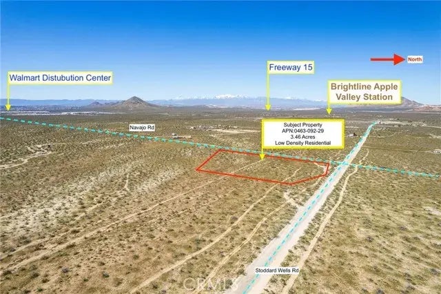 Seize a prime investment opportunity in Apple Valley with this 3.457-acre corner lot located at the intersection of Stoddard Wells Rd and Navajo Rd. Ready for development, this property offers immediate access to water and electricity, setting a seamless foundation for your vision. Positioned just 2.5 miles from the future Brightline High Speed Rail Station and adjacent to Highway 15, the lot promises significant growth potential in a town poised for transformation. With its strategic location and the upcoming infrastructural developments, this land represents not just a piece of property but a gateway to possibility in California's next golden town. Ideal for investors looking to capitalize on Apple Valley's expansion, this lot offers visibility, accessibility, and the promise of appreciation. Here, the opportunity to shape the future of a burgeoning community awaits. Invest in a parcel that stands at the crossroads of progress and potential in Apple Valley.